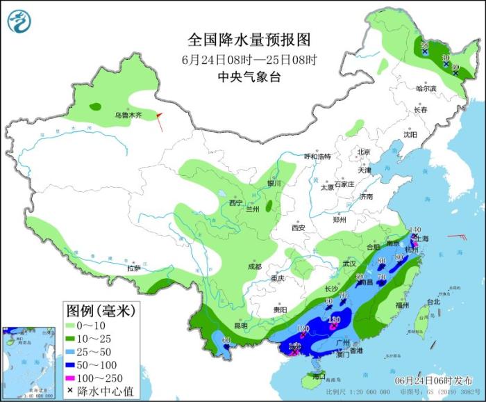 全國降水量預(yù)報圖(6月24日08時-25日08時)