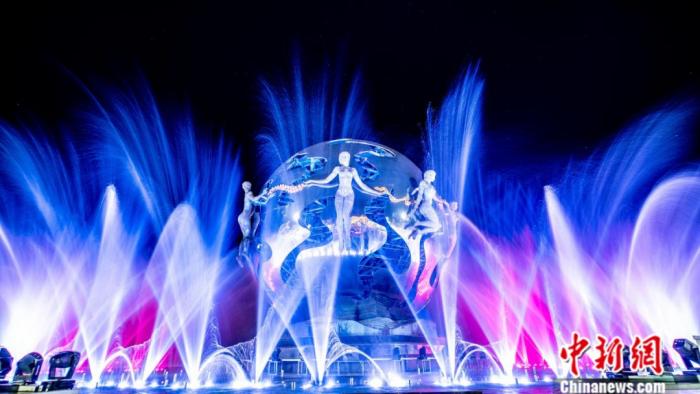 噴泉隨著音樂起伏翻飛、五彩繽紛