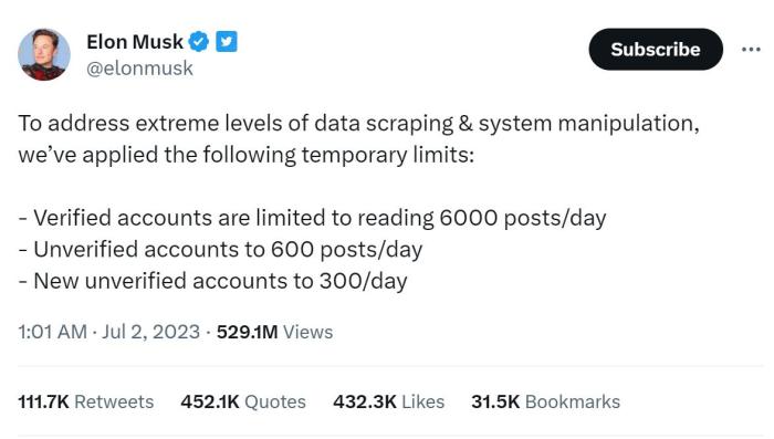 收購近一年,馬斯克對(duì)于推特的改革仍在進(jìn)行中。他最新宣布要限制用戶每日的推文瀏覽量,以避免使用人工智能模型的公司對(duì)推特進(jìn)行“數(shù)據(jù)抓取和系統(tǒng)操縱”。