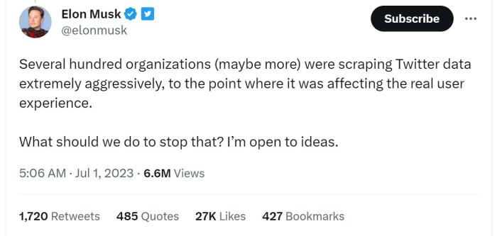 他還發(fā)布推文稱,數(shù)百個(gè)甚至更多的組織正在“極其積極地”抓取推特?cái)?shù)據(jù),“這影響了真正的用戶體驗(yàn)”,但馬斯克尚未說明限制會(huì)持續(xù)多久,也并未表示在什么條件下將取消限制。