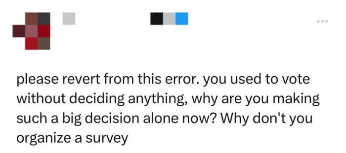 有網(wǎng)友呼吁,“請(qǐng)改正這個(gè)錯(cuò)誤。你以前在投票時(shí)都不做出任何決定,為什么現(xiàn)在要獨(dú)自做出這么大的決定?你為什么不組織一次調(diào)查?!?/p>