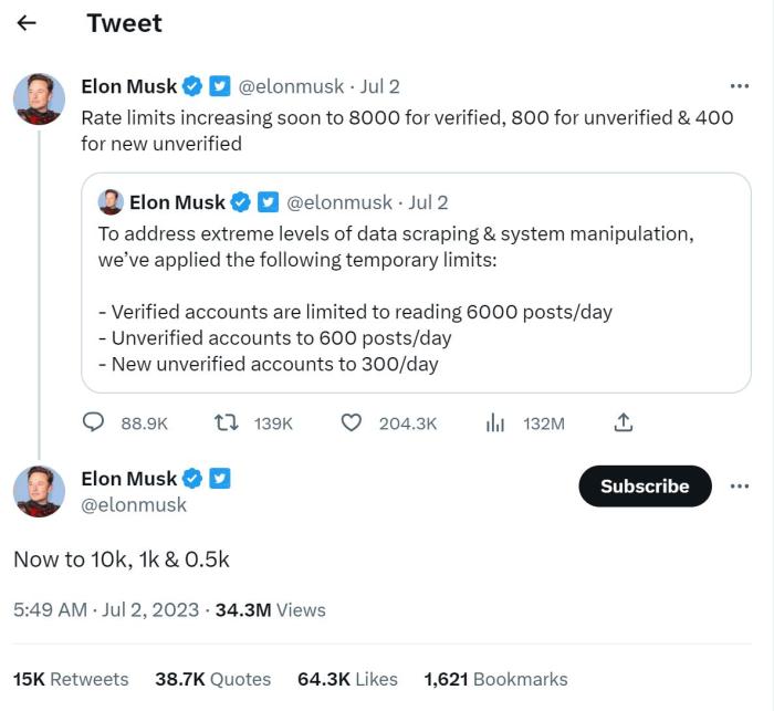 對(duì)此,馬斯克很快做出了反應(yīng)。在宣布最初限制后僅幾小時(shí),他又發(fā)文稱,將限制提高到了已驗(yàn)證賬戶8000條、未驗(yàn)證賬戶800條、新的未驗(yàn)證賬戶400條,并在當(dāng)天再次將限制瀏覽量分別提高到了10000條、1000條和500條。