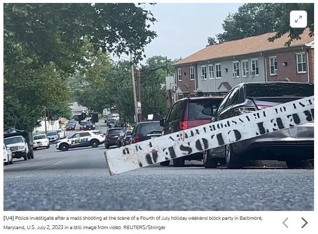 當(dāng)?shù)貢r(shí)間7月2日凌晨,美國馬里蘭州巴爾的摩的一場社區(qū)派對結(jié)束后,發(fā)生了大規(guī)模槍擊事件,造成2人死亡,28人受傷,其中包括14名未成年人。圖片來源:路透社報(bào)道截圖