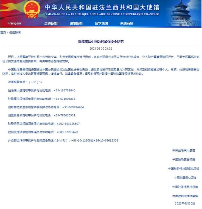 法國(guó)騷亂持續(xù),中國(guó)駐法國(guó)使領(lǐng)館發(fā)布安全提醒!