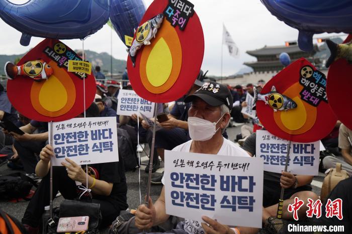 當(dāng)?shù)貢r(shí)間7月8日,韓國(guó)多個(gè)市民團(tuán)體和在野黨在首爾集會(huì),抗議日本強(qiáng)推核污染水排海計(jì)劃?!≈行律缬浾?劉旭 攝