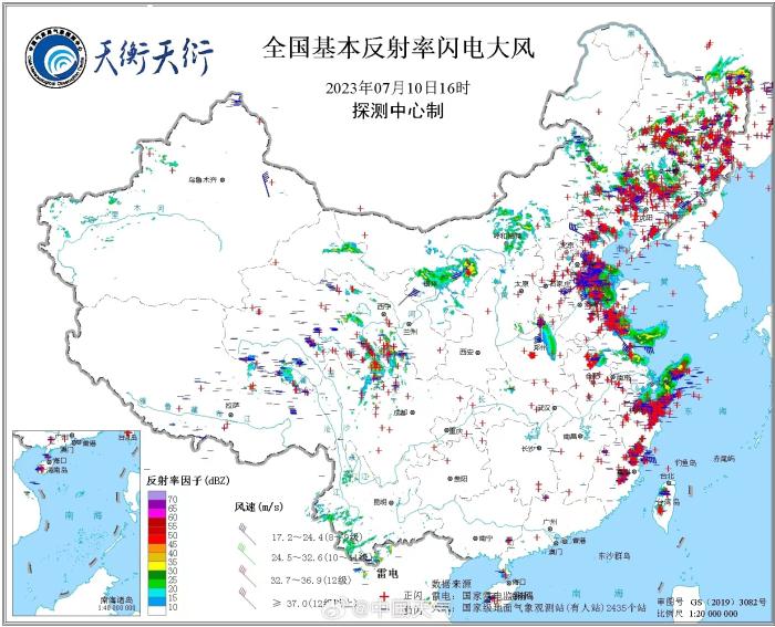 7月10日全國基本反射率閃電大風(fēng)。圖片來源:@中國天氣微博