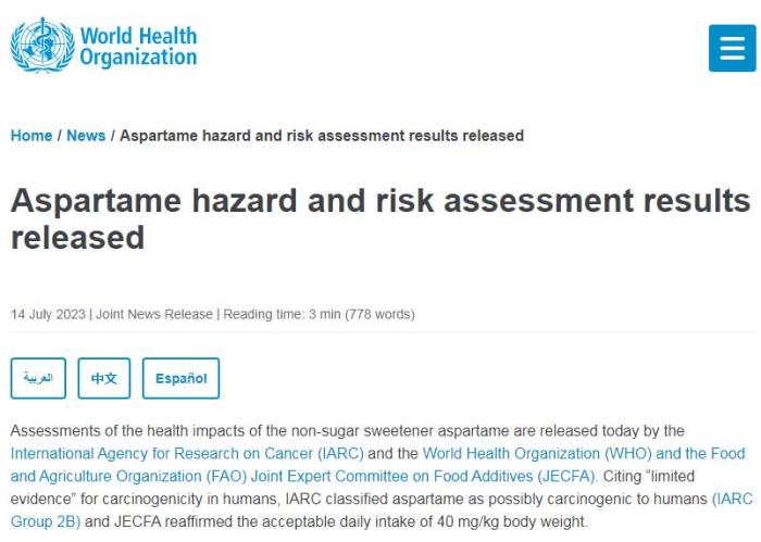 近期以來,“阿斯巴甜致癌”爭議引起廣泛關注。14日,世衛(wèi)組織官網(wǎng)上發(fā)布消息,國際癌癥研究機構(IARC)、世界衛(wèi)生組織和聯(lián)合國糧食及農業(yè)組織(FAO)食品添加劑聯(lián)合專家委員會(JECFA)發(fā)布了阿斯巴甜對健康影響的評估結果。
