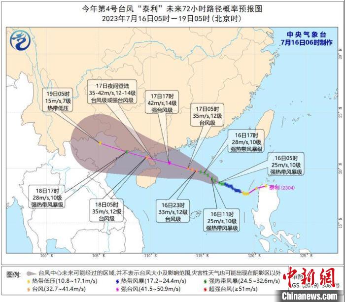 海南省氣象臺(tái)預(yù)計(jì),“泰利”中心將以每小時(shí)15公里左右的速度向西北方向移動(dòng),強(qiáng)度繼續(xù)增強(qiáng),并于17日夜間在海南文昌到廣東臺(tái)山一帶沿海登陸(臺(tái)風(fēng)級(jí)或強(qiáng)臺(tái)風(fēng)級(jí),35~42米/秒,12~14級(jí)),之后于18日進(jìn)入北部灣,以后趨向越南北部沿海和廣西沿海。