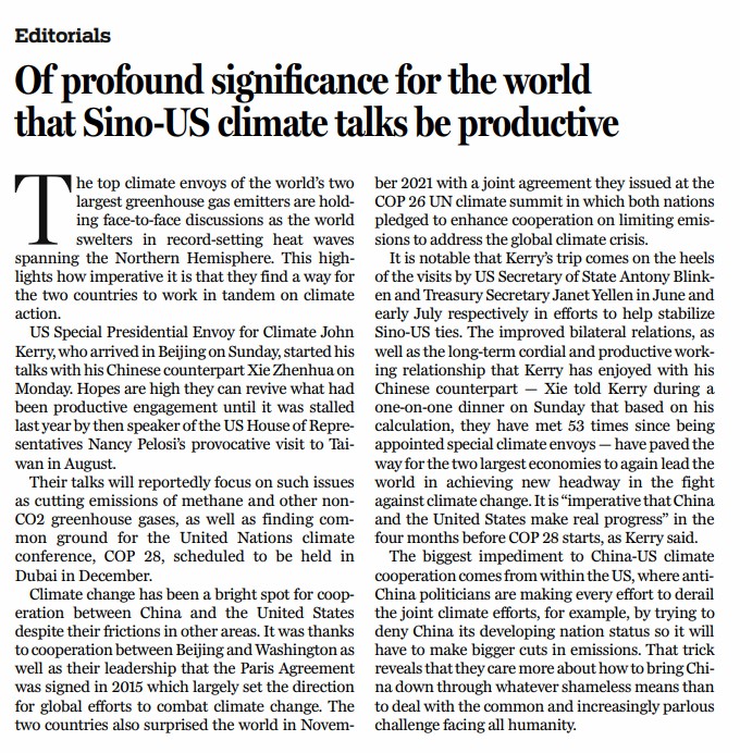 在舉世關(guān)注中,世界最大的兩個(gè)經(jīng)濟(jì)體的氣候特使舉行了面對(duì)面會(huì)談。當(dāng)前,北半球正在經(jīng)歷創(chuàng)紀(jì)錄的熱浪,凸顯了中美在氣候問題上攜手合作多么重要。