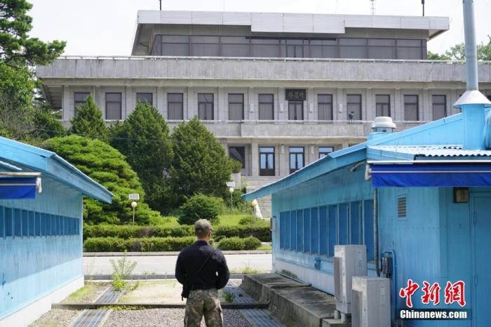 圖為韓朝邊境板門店共同警備區(qū)(JSA),韓方一側(cè)的士兵面向朝方警戒執(zhí)勤。 中新社記者 劉旭 攝