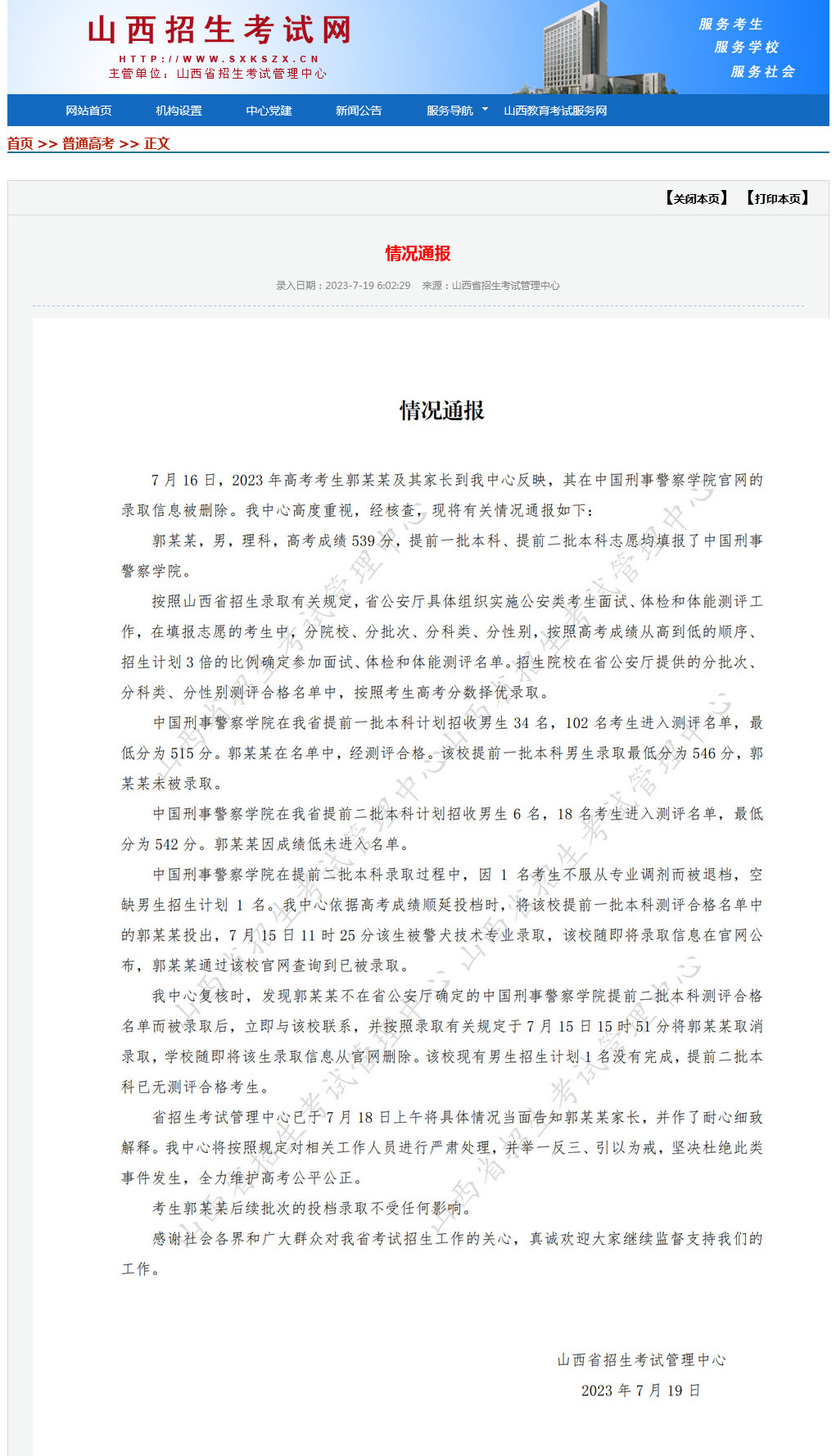 中新網(wǎng)7月19日電 據(jù)山西招生考試網(wǎng)消息,山西省招生考試管理中心19日發(fā)布情況通報稱,7月16日,2023年高考考生郭某某及其家長到該中心反映,其在中國刑事警察學院官網(wǎng)的錄取信息被刪除。該中心高度重視,經(jīng)核查,有關(guān)情況如下: