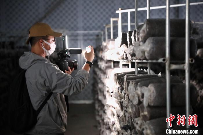 7月17日,甘肅省古浪縣,參加“絲路風(fēng)采 如意甘肅”聯(lián)合采訪活動的兩岸及香港記者在當(dāng)?shù)仞B(yǎng)菌出菇的冷庫內(nèi)采訪拍攝?!≈行律缬浾?李雪峰 攝
