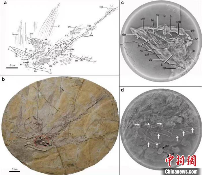 熱河鳥標本(IVPP V14978)的線描、攝影和掃描。中國科學院古脊椎所 供圖