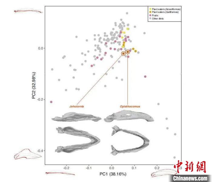 包括熱河鳥和現(xiàn)存鳥類在內(nèi)的三維下頜形狀PCA圖,重點與現(xiàn)存植食性鳥類對比。中國科學院古脊椎所 供圖