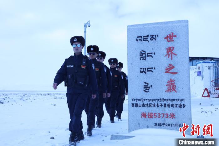 圖為袁浩杰與戰(zhàn)友在海拔5373米的普瑪江塘邊境派出所巡邏。山南邊境管理支隊供圖