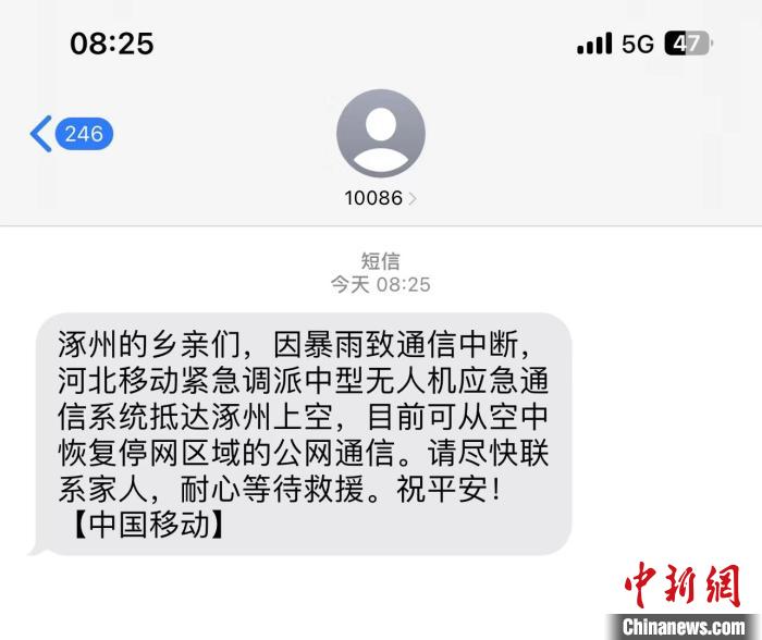 中新網(wǎng)石家莊8月3日電 (郝燁 趙景科)“【中國移動(dòng)】涿州的鄉(xiāng)親們,因暴雨致通信中斷,河北移動(dòng)緊急調(diào)派中型無人機(jī)應(yīng)急通信系統(tǒng)抵達(dá)涿州上空,目前可從空中恢復(fù)停網(wǎng)區(qū)域的公網(wǎng)通信。請(qǐng)盡快聯(lián)系家人,耐心等待救援。祝平安!”8月3日早,河北涿州災(zāi)區(qū)的群眾收到一條來自空中的短信。
