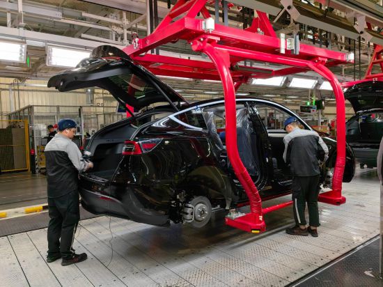 在特斯拉上海超級(jí)工廠,工人在車間內(nèi)忙碌(2月27日攝)。新華社記者 周蕊 攝