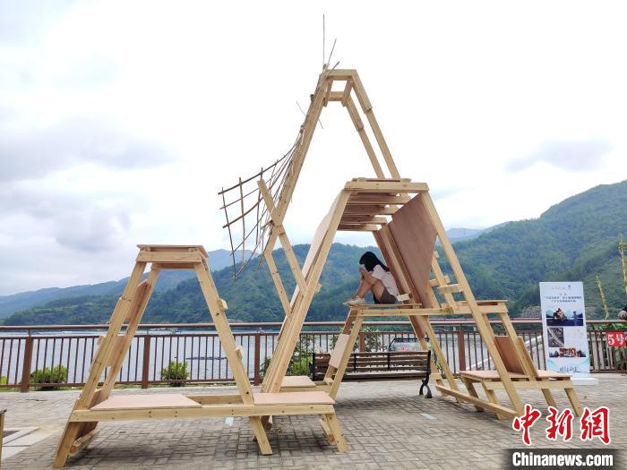 “高低起伏的木板,代表了環(huán)繞在雄江鎮(zhèn)旁的群山,座椅蜿蜒的形狀則是波浪滔滔的閩江?!眮碜耘_灣華夏科技大學的學生陳廷宇如是介紹作品《禹岳》。