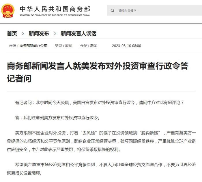 中國商務部新聞發(fā)言人8月10回應稱,美方限制本國企業(yè)對外投資,打著“去風險”的幌子在投資領域搞“脫鉤斷鏈”,嚴重背離美方一貫提倡的市場經(jīng)濟和公平競爭原則,影響企業(yè)正常經(jīng)營決策,破壞國際經(jīng)貿(mào)秩序,嚴重擾亂全球產(chǎn)業(yè)鏈供應鏈安全,中方對此表示嚴重關切,將保留采取措施的權(quán)利。