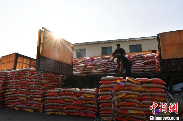 8月15日,河北省涿州市供銷社農(nóng)資集采集配中心,一輛滿載34噸冬小麥種子的農(nóng)資配送車輛抵達這里,工人們正在卸車。中新社記者 翟羽佳 攝