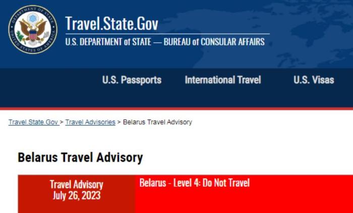 目前,美國(guó)務(wù)院對(duì)赴白俄羅斯的旅行建議為最高級(jí)別4級(jí),即 “請(qǐng)勿前往”。