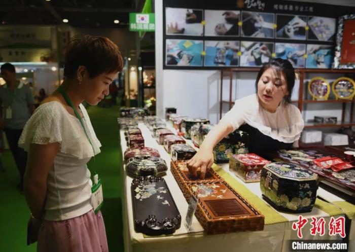 在浙江杭州舉行的第二屆中國國際茶葉博覽會上,一名參觀者被展出的韓國茶器吸引。王剛 攝