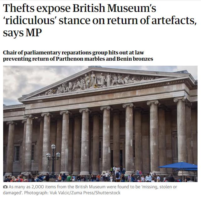 中新網(wǎng)8月28日電 據(jù)英國《衛(wèi)報》當?shù)貢r間27日報道,對于近期大英博物館館藏被盜事件,一名英國議員表示,該事件暴露了大英博物館以安全為由,拒絕將有爭議文物歸還原籍國的借口“荒謬”且“具有侮辱性”。