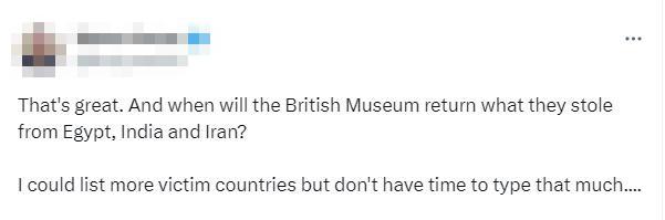 不少網(wǎng)友也在社交媒體上發(fā)文,要求大英博物館采取行動。有人表示,“大英博物館什么時候能歸還他們從埃及、印度和伊朗偷來的東西?我可以列出更多受害國家……”