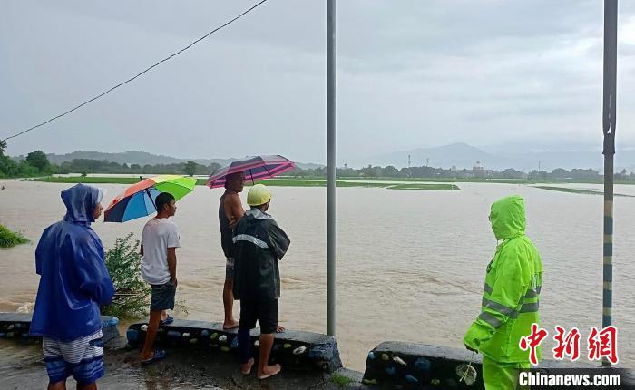 9月3日,菲律賓北部南伊羅戈省圣盧西亞市,當(dāng)?shù)鼐葹?zāi)人員在帕拉通社區(qū)一座大橋上查看水情。(菲律賓圣盧西亞市警察局 供圖)