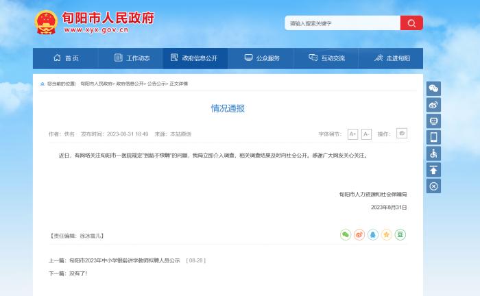 8月31日,據(jù)旬陽市人民政府網(wǎng)站發(fā)布情況通報(bào),旬陽市人力資源和社會(huì)保障局已對(duì)此介入調(diào)查,相關(guān)調(diào)查結(jié)果及時(shí)向社會(huì)公開。