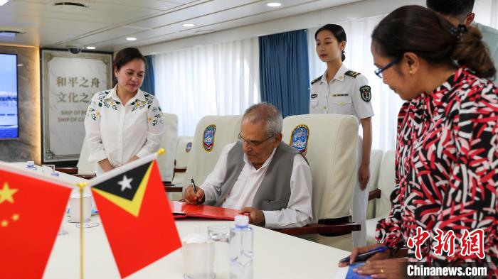 9月3日上午,正在執(zhí)行“和諧使命-2023”任務(wù)的中國(guó)海軍“和平方舟”號(hào)醫(yī)院船抵達(dá)東帝汶帝力港,開始為期7天的友好訪問和醫(yī)療服務(wù)。圖為東帝汶總統(tǒng)奧爾塔在醫(yī)院船簽名簿上留言。黎宇 攝