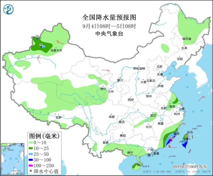 9月4日08時(shí)至5日08時(shí),新疆沿天山地區(qū)和伊犁河谷、福建東南部、廣東東部、海南島西北部、臺(tái)灣島等地部分地區(qū)有中到大雨,其中,福建東南部沿海地區(qū)、廣東東南部沿海、臺(tái)灣島東部等地部分地區(qū)有暴雨或大暴雨(100~160毫米)。內(nèi)蒙古西北部、新疆南疆盆地、福建東部沿海等地部分地區(qū)有5~7級(jí)風(fēng)。東海南部、臺(tái)灣以東洋面、臺(tái)灣海峽、巴士海峽、南海東北部有6~8級(jí)大風(fēng)、陣風(fēng)10~11級(jí),其中臺(tái)灣以東洋面、臺(tái)灣海峽、巴士海峽北部、南海東北部部分海域風(fēng)力可達(dá)9~11級(jí)、陣風(fēng)13~14級(jí)。