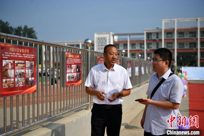 9月1日,涿州市刁窩中學(xué)校長孫常見(左)向中新社記者講述“筑夢路”背后的故事。 中新社記者 翟羽佳 攝