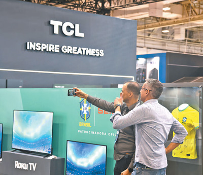 在2023年圣保羅國(guó)際消費(fèi)類電子及家用電器產(chǎn)品展覽會(huì)上,參觀者在TCL展臺(tái)前合影留念。