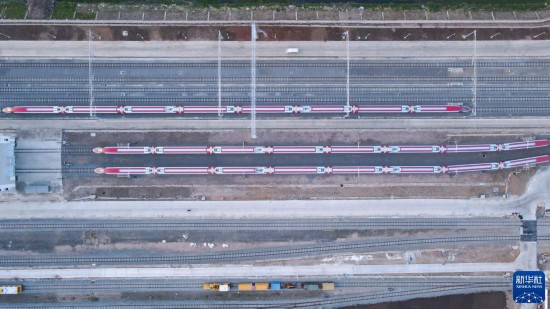 7月20日,雅萬(wàn)高鐵列車??吭谟《饶嵛鱽喨f(wàn)隆德卡魯爾動(dòng)車所附近(無人機(jī)照片)。新華社記者 徐欽 攝