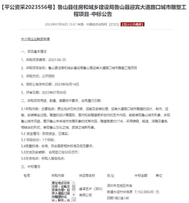 中國(guó)政府采購網(wǎng)公開的中標(biāo)公告顯示,這座位于魯山縣迎賓大道路口城市雕塑工程項(xiàng)目,中標(biāo)金額達(dá)到715.2萬元,資金情況為“財(cái)政資金,已落實(shí)”。