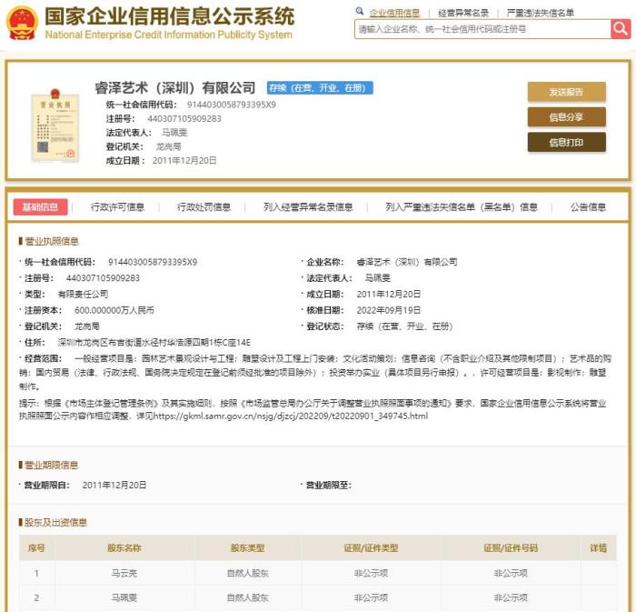 國(guó)家企業(yè)信用信息公示系統(tǒng)顯示,睿澤藝術(shù)(深圳)有限公司成立于2011年12月,法定代表人為馬珮雯,注冊(cè)資本600萬人民幣。公司由馬云亮、馬珮雯共同持股,馬云亮持股75%,為公司實(shí)控人。