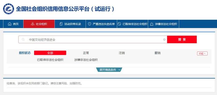 但中新財(cái)經(jīng)記者在全國(guó)社會(huì)組織信用信息公示平臺(tái)查詢發(fā)現(xiàn),中國(guó)城市雕塑建設(shè)研究院、中國(guó)文化經(jīng)濟(jì)促進(jìn)會(huì)均未在民政部門登記。