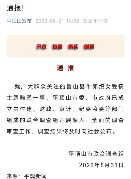 8月31日,“平頂山發(fā)布”公眾號(hào)發(fā)布通報(bào),就廣大群眾關(guān)注的魯山縣牛郎織女愛情主題雕塑一事,平頂山市委、市政府已成立由住建、財(cái)政、審計(jì)、紀(jì)委監(jiān)委等部門組成的聯(lián)合調(diào)查組開展深入、全面的調(diào)查審查工作,調(diào)查結(jié)果將及時(shí)向社會(huì)公布。