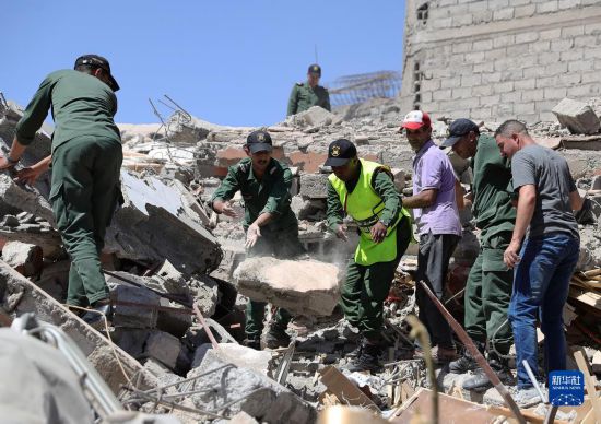 9月11日,救援人員在摩洛哥馬拉喀什南部的艾米茲米茲村地震廢墟上搜救。新華社記者王東震攝