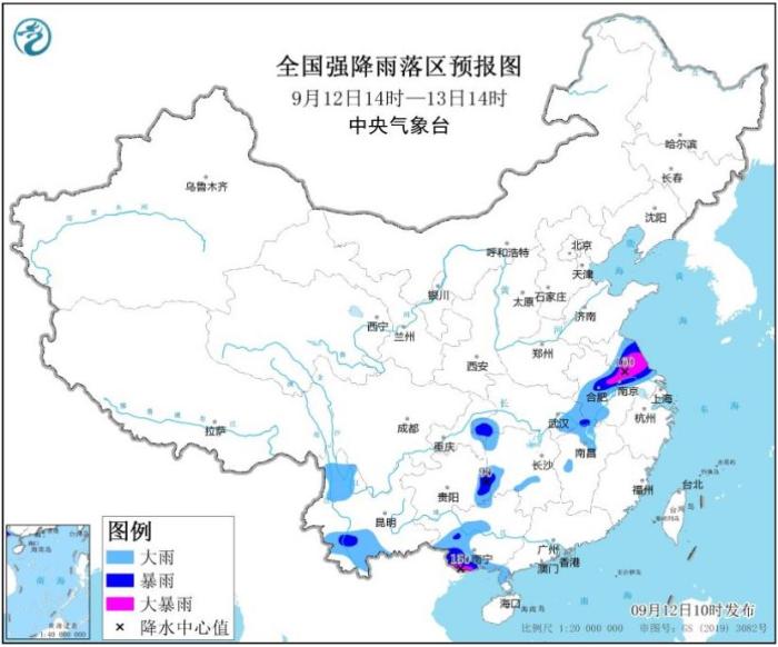 預(yù)計(jì),9月12日14時(shí)至13日14時(shí),江蘇中部、安徽中部、湖北東南部和西南部、江西北部、湖南西部、貴州東南部、云南西北部和南部、廣西西部和南部等地部分地區(qū)有大到暴雨,其中,江蘇中部、安徽中部偏東地區(qū)、廣西南部等地部分地區(qū)有大暴雨(100~160毫米);上述地區(qū)最大小時(shí)降雨量30~50毫米,局地可超過60毫米,局地還有雷暴大風(fēng)等強(qiáng)對(duì)流天氣。