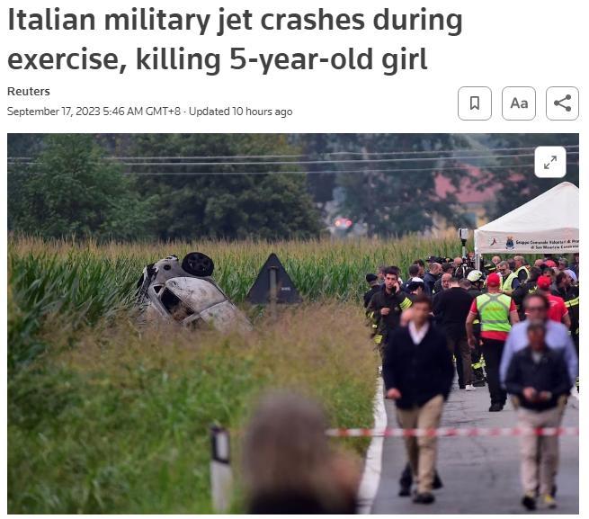 中新網(wǎng)9月17日電 綜合外媒報道,當(dāng)?shù)貢r間16日,意大利空軍“三色箭”飛行表演隊的一架飛機在都靈郊外訓(xùn)練時墜毀,導(dǎo)致地面一名5歲女童身亡,飛行員在墜毀前彈射逃生。