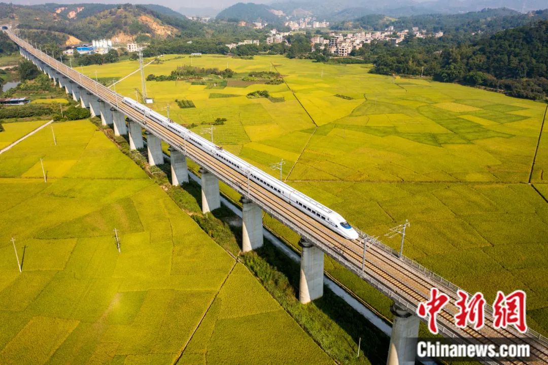 廣西梧州市龍圩區(qū)大坡鎮(zhèn)河步村,一列動(dòng)車(chē)穿行于金色稻田。何華文 攝