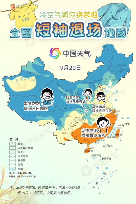 中國天氣網(wǎng)訊 進入9月中旬,冷空氣變“勞模”頻繁來襲,西北、東北大部都已邁入秋天門檻,但華北一帶今年秋天似乎來得有點兒晚,南方地區(qū)白天甚至熱到還要開空調(diào),不少網(wǎng)友喊話“秋高氣爽何時能來?”今起三天(9月19日至21日),受冷空氣和降雨共同影響,長江以北大部地區(qū)將陸續(xù)迎來降溫,開啟秋日初體驗。中國天氣網(wǎng)特別推出全國短袖退場地圖,看看哪里可以安排秋天的第一件長袖。
