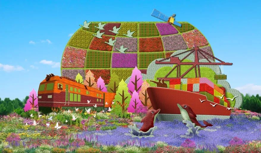 7. 西單東南角的“幸福之路”花壇頂高9米,以中歐班列、貨輪以及海豚為主景,寓意共同把“一帶一路”這條造福世界的幸福之路鋪得更寬更遠。