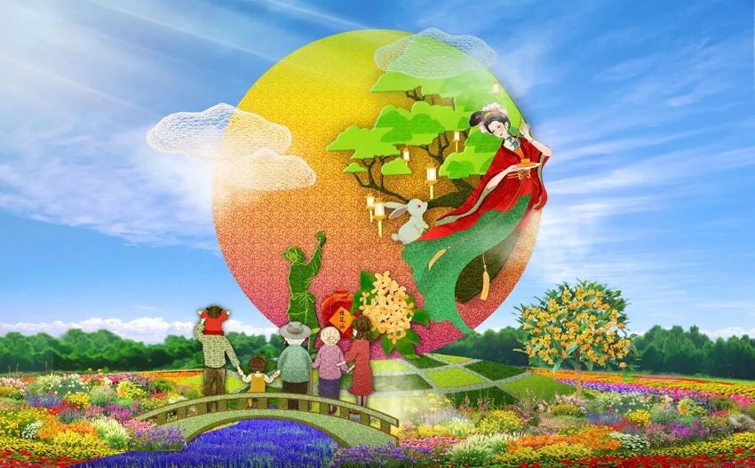8. 西單西北角的“花好月圓”花壇頂高8米,以一家人中秋團聚的溫馨畫面為場景,體現(xiàn)了花好月圓下的群眾幸福生活。