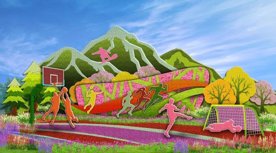 6. 西單東北角的“全民健身”花壇頂高8.5米,以豐富多彩的全民健身為題材,配以籃球、羽毛球、跑步、滑雪等運動場景,寓意全民健身共享美好生活。