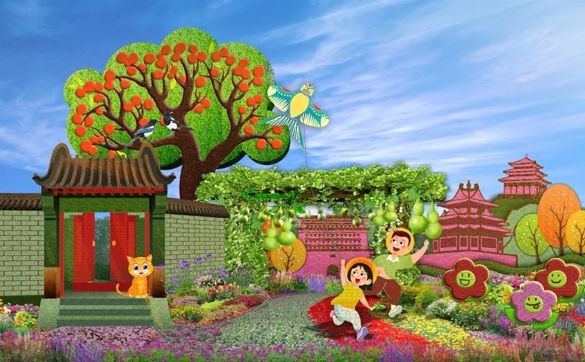 3. 東單東南角的“共同富裕”主題花壇頂高達9.5米,以欣欣向榮的城鄉(xiāng)融合發(fā)展為場景,描繪了中國式現(xiàn)代化全體人民共同富裕的美好藍圖。