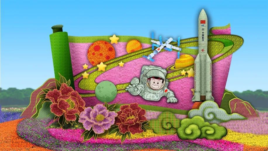 10. 復興門東北角的“筑夢未來”花壇頂高8.5米,以中國航天員、空間站為主景,寓意航天強國建設(shè)蓬勃發(fā)展,助力中國夢早日實現(xiàn),全面推進中華民族偉大復興,譜寫新時代中國特色社會主義更加絢麗的華章。