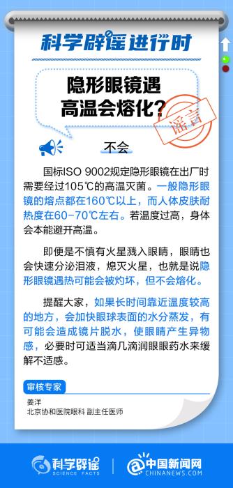 中新網(wǎng)9月20日電 吃火鍋時戴隱形眼鏡會熔化嗎?一般隱形眼鏡的熔點都在160℃以上,而人體皮膚耐熱度在60-70℃左右。若溫度過高,身體會本能避開高溫。即便是不慎有火星濺入眼睛,眼睛也會快速分泌淚液,熄滅火星,也就是說隱形眼鏡遇熱可能會被灼壞,但不會熔化。(來源:@科學(xué)辟謠 @中國新聞網(wǎng) )